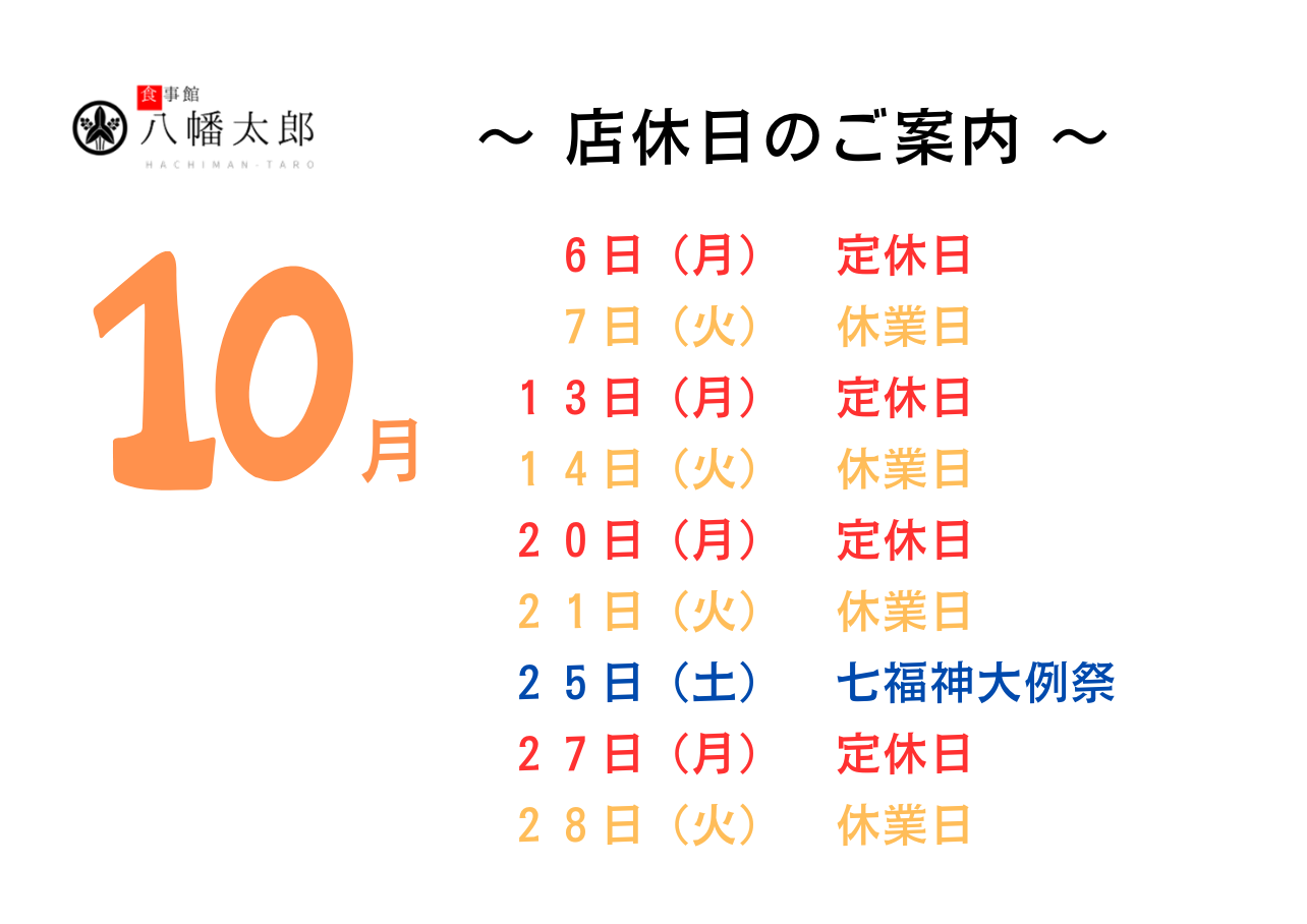 10月のお休みについて 2025年10月7日2025年10月1日 by hachiman-taro いつも当店をご利用いただきありがとうございます。10月の営業についてのお知らせです。 ※10月25日 (土) は、七福神大例祭となります。