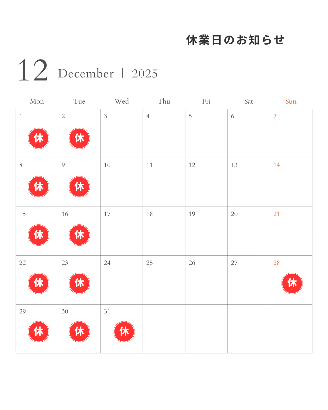 【12月の定休日・休業日】 毎週 月曜日 および 火曜日 (※スタッフ不足のため、当面の間、火曜日も休業日とさせていただきます。) 第3火曜日(12月16日)